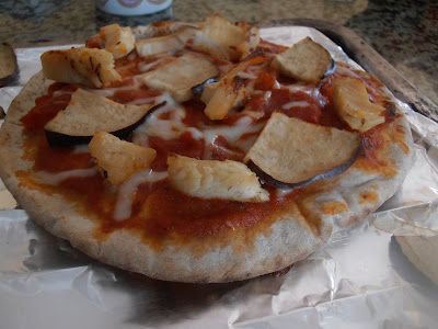 For today's lunch, I used whole-wheat pita bread to make chicken&eggplant pizza.